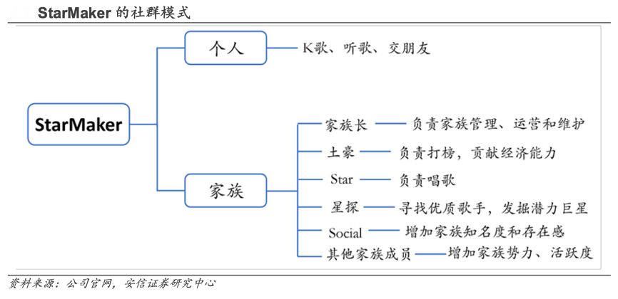 經(jīng)典案例:根據(jù)公司官網(wǎng)、安信證券研究中心等綜合資訊表明,StarMaker 通過強(qiáng)社交屬性與海量音樂版權(quán)加固競(jìng)爭(zhēng)壁壘。StarMaker 加入語音聊天室 K 歌模式,打造 200 人左右“家族”式社交 群,家族人數(shù)受限,使得家族長(zhǎng)在審核成員時(shí)格外認(rèn)真,普通成員全力貢獻(xiàn)自己的力量,用戶形成緊密社群關(guān)系。