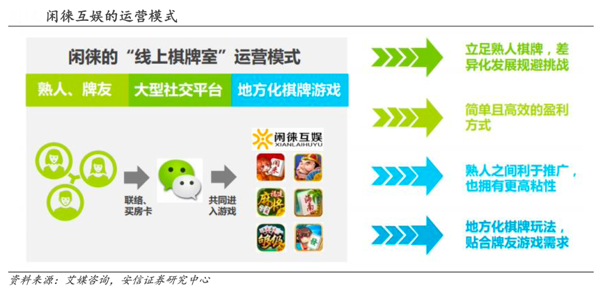 經(jīng)典案例:根據(jù)艾媒咨詢、安信證券研究中心等綜合資訊表明,閑徠互娛主要的銷售模式是房卡模式,相當(dāng)于將線下棋牌室移到線上。先在當(dāng)?shù)赝茝V吸引第一批客戶,再利用類似微商代理模式,在熟人中迅速傳播。靠熟人傳播,閑徠互娛的用戶規(guī)模和用戶粘性遠(yuǎn)高于同類棋牌游戲。