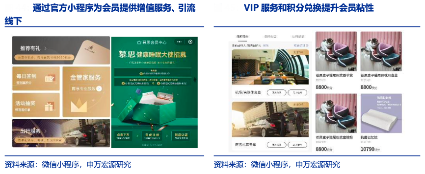 經典案例:根據微信小程序、申萬宏源研究等綜合資訊表明,慕思股份持續升級數字化工具,借助小程序聚焦會員服務,鞏固核心客戶群,提升轉化率和會 員粘性。2021 年 11 月公司CRM 系統上線,通過數字化系統更有效獲取信 息、洞察會員需求。
