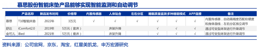 經典案例:根據公司官網、京東、淘寶、紅星美凱龍、申萬宏源研究等綜合資訊表明,慕思股份2023 年推出“世紀夢”新品,健康+智能+定制融合賽道旗艦款,融合“精準分區舒壓、支撐技術、透氣技術、抑菌防螨、雙重邊緣加固、VIRASE 病毒防護、 航空級環保標準”7 大技術,套餐化營銷打法主動進攻市場,持續深耕智慧睡眠科技。