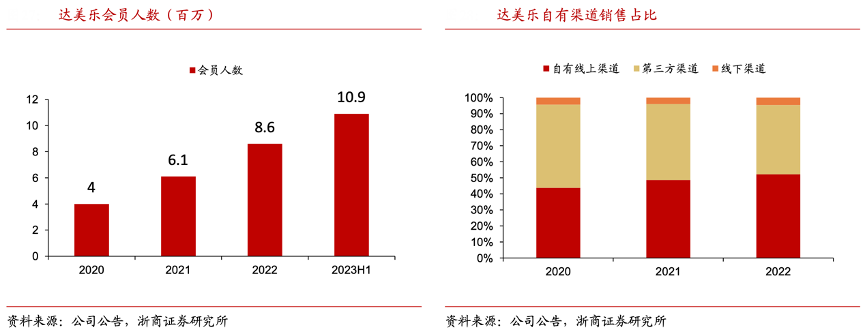 經典案例:根據公司公告、浙商證券研究所等綜合資訊表明,達美樂打造專有消費者數據平臺,其已建立專有 CDP 跟蹤客戶的特定需求與偏好,基于消費者洞察,進行針對性的推新和營銷。此外,顧客可以在自有渠道(網站、小程序和 APP 等)加入會員計劃,只有在自有渠道(22 年銷售占比 52%)的訂單才能獲得積分獎勵,進一步培養了顧客的消費習慣,2023 年上半年會員數增長至 10.9 百萬。