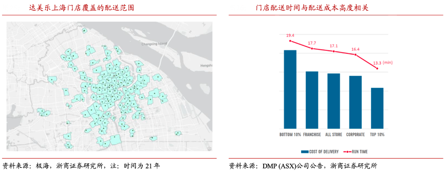 經典案例:根據極海、DMP(ASX)公司公告、浙商證券研究所等綜合資訊表明,達美樂為了實現 30 分鐘必達承諾,其在擴張門店網絡時,確保 門店的配送區域覆蓋至高密度的住宅及商業區,同時積極優化門店的配送半徑提升外送效率。根據極海品牌監測,達美樂選址采用平鋪方式,在北京和上海城市門店已經基本覆蓋主要區域。