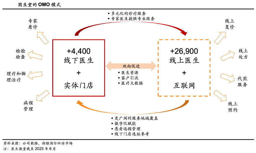 經典案例:根據公司數據、招銀國際環球市場等綜合資訊表明,固生堂自 2018 年起開始提供互聯網醫療服務,公司通過其微信官方公眾號為客戶提供線下門診預約、在線復診、診斷以及處方等服務。固生堂于 2021 年 2 月在廣州設立固生堂互聯網醫院管理有限公司,用于管理其收購的白露和萬家互聯網醫院平臺。