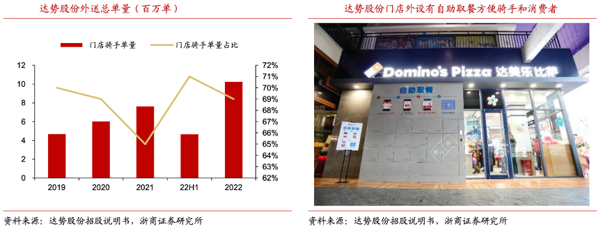 經(jīng)典案例:根據(jù)達勢股份招股說明書、浙商證券研究所等綜合資訊表明,達美樂中國區(qū)別于其他比薩品牌,其依靠獨家配備的專業(yè)騎手來完成外送訂單,專業(yè)騎手常駐門店,并且僅配送公司門店訂單從而避免交叉污染,確保食品安全。同時通其進一步加強了公司 30 分鐘必達承諾的能力。