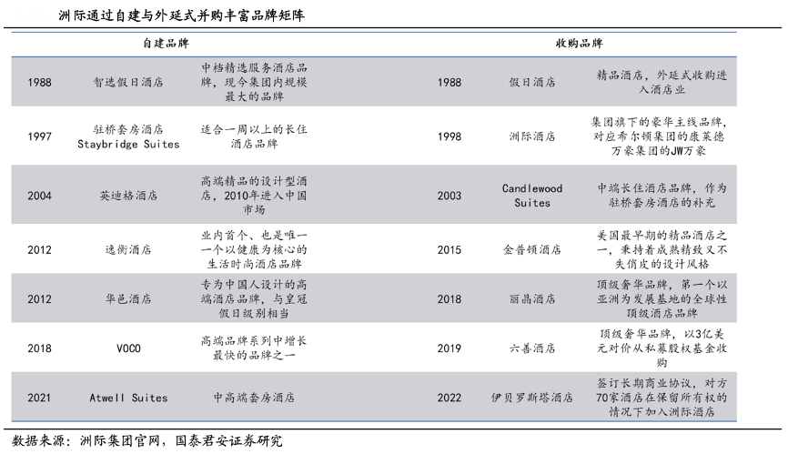 經典案例:根據洲際集團官網、國泰君安證券研究等綜合資訊表明,在自建品牌方面,洲際酒店集團早于收購假日酒店的同時創立“智選假日”填補中端市場空缺,接著創立長住品牌駐橋套房酒店;業務拆分后又推出逸衡酒店、VOCO 酒店、阿特維爾套房酒店等多個品牌。2002年至 2022 年,洲際集團旗下酒店數量從 3325 家增長至 6164 家。