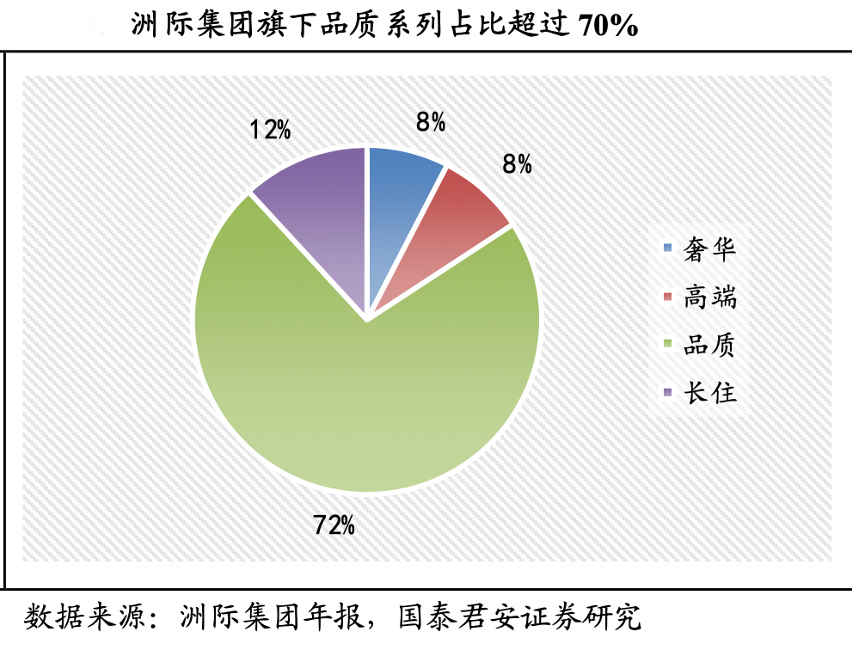 經典案例:根據洲際集團年報、國泰君安證券研究等綜合資訊表明,自收購假日酒店進入酒店行業以來,洲際集團不斷向頂級奢華與中端精品兩個方向擴展旗下品牌。截止 2022 年底,洲際 酒店集團旗下奢華/高端/品質/長住酒店數量分別為 457 家/491 家/4348 家/712 家。品質系列占比超過 70%,成為集團規模擴張的主要貢獻者。