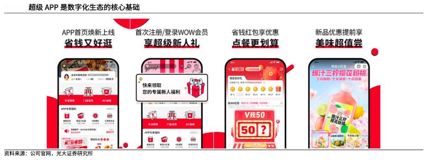 經典案例:根據公司官網、光大證券研究所等綜合資訊表明,作為行業內數字化創新先鋒,百勝中國于 2016 年陸續推出肯德基和必勝客的超級 Apps,成為首批向顧客提供移動化支付的連鎖餐廳之一。超級 App 支持支付 寶、微信支付和神錢包等支付方式,隨著移動支付普及程度的提高和消費者習慣的改變,數字化支付占公司銷售額的比例逐年提高,由 2016 年的 33%提升至 2022 年的 99%。
