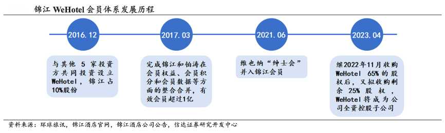 經典案例:根據環球旅訊、錦江酒店官網、錦江酒店公司公告、信達證券研究開發中心等綜合資訊表明,錦江完成對盧浮、鉑濤和維也納的收購后開始推進旗下酒店會員資源整合,2016 年與第三方合資成立 WeHotel 負責會員生態體系建設;2017年完成對鉑濤會員的整合,有效會員人數超過 1 億;2021 年完成對維也納旗下“紳士會”會員體系向錦江會員的升級,原“紳士會”近 3000 萬會員全部升級為錦江酒店會員。