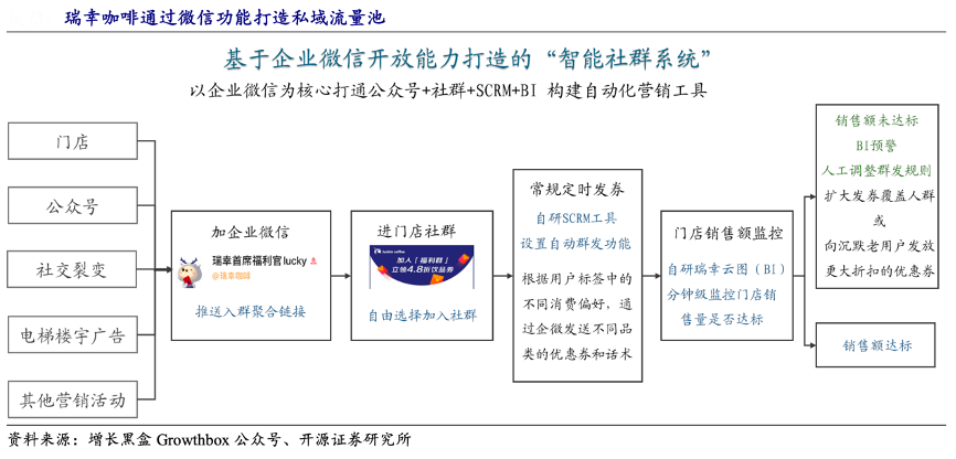 經(jīng)典案例:根據(jù)增長黑盒Growthbox公眾號、開源證券研究所等綜合資訊表明,隨著消費人群增加,瑞幸開始通過大量企業(yè)微信社群構(gòu)建用戶私域流量池,并采用積分、優(yōu)惠券、折扣等獎勵機制,增加用戶的黏性,提高用戶復(fù)購率。