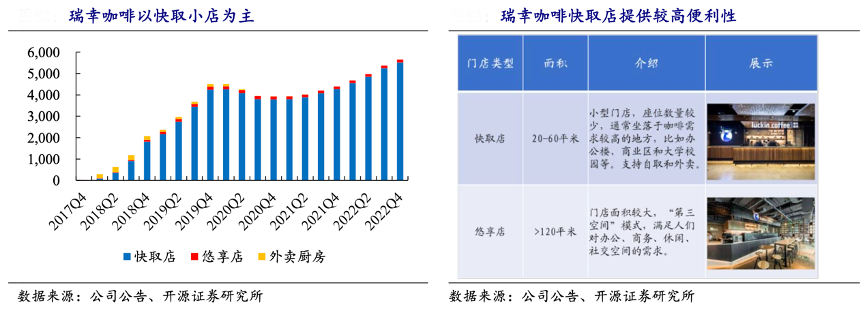經(jīng)典案例:根據(jù)公司公告、開源證券研究所等綜合資訊表明,瑞幸咖啡門店類型大部分以快取店為主。瑞幸的快取門店集中在咖啡需求量較大的地區(qū),例如寫字樓、商業(yè)區(qū)和大學(xué)校園,同時門店面積小,大部分在 20-60 平方米之間,定位“快咖啡”消費場景。