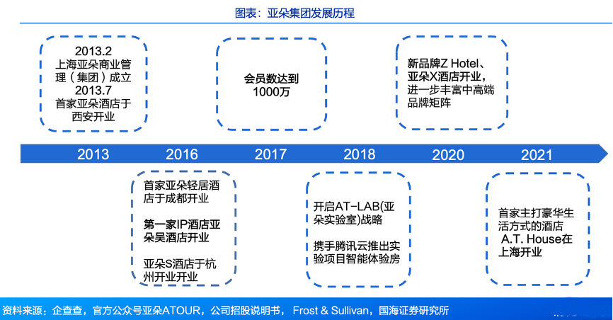 經典案例:根據企查查、官方公眾號亞朵ATOUR、公司招股說明書、Frost&Sullivan、公司公告、國海證券研究所等綜合資訊表明,亞朵集團是始于住宿的生活方式品牌集團,「中國體驗」倡導者。公司在以中高端為主力的基礎上,自主孵化定位中端的輕居酒店與定位高端的S酒店。2020年9月,新品牌Z Hotel、亞朵X酒店開業;2021年6月首家主打豪華生活方式的酒店 A.T. House在上海開業,品牌矩陣得到進一步完善。
