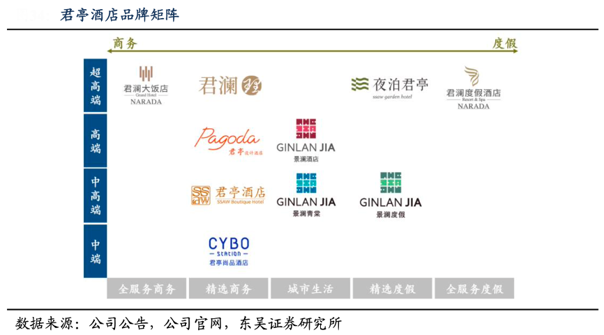 經(jīng)典案例:根據(jù)公司公告、公司官網(wǎng)、東吳證券研究所等綜合資訊表明,截至 2022 年 2 月,君瀾品牌布局浙江、江蘇、海南等超 23 個省市,累計投資管理超過 180 家酒店,景瀾布局遍及浙江、海南、吉林等 13 個省市,累計投資管理酒 店 75 家。收購完成后,君亭實現(xiàn)規(guī)模躍遷,正式躋身于國內民族酒店集團前列,至此,君亭的品牌矩陣進一步完善,完成對中高端和高端商務以及休閑品牌的全覆蓋。