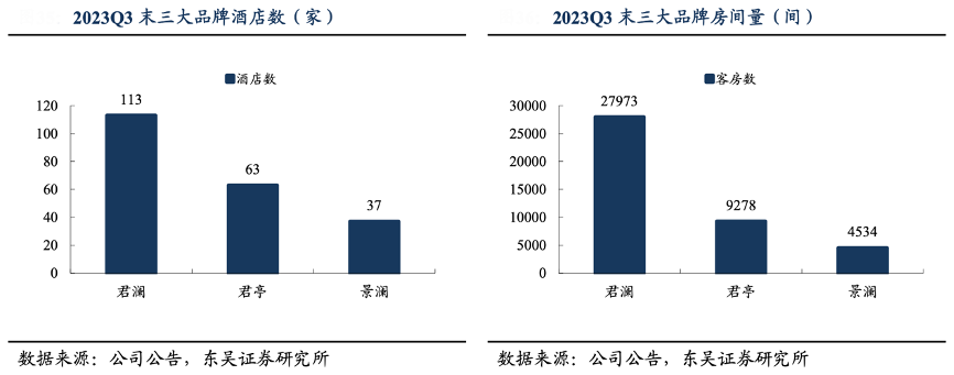 經(jīng)典案例:根據(jù)公司公告、東吳證券研究所等綜合資訊表明,君亭君瀾旗下包含“君瀾大飯店”、“君瀾度假酒店”以及“君瀾理”,領銜高端度假、商旅酒店行業(yè)。景瀾源于君瀾,定位中高端社區(qū)生活酒店,發(fā)展出“景瀾酒店”、“景瀾度假”以及“景瀾青棠”。截至 2023 年 Q3 末,君瀾、君亭與景瀾開業(yè)酒店數(shù)分別為 113/63/37 家,房間數(shù)分別為 27973/9278/4534 間。三大品牌定位互補,深耕高端度假與商旅酒店市場。