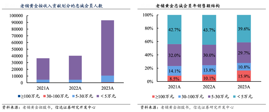 經典案例:根據老鋪黃金招股書、信達證券研究開發中心等綜合資訊表明,老鋪黃金忠誠會員人數快速增長,高級別會員銷售貢獻持續提升。2023 年,在老鋪黃金購買至少一次的忠誠會員人數翻倍以上增長,達到 9.3 萬人,同比增幅 131%。其中,年消費額 100 萬 元及以上的忠誠會員貢獻了公司 15.9%的收入。