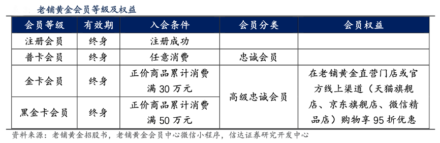 經典案例:根據老鋪黃金招股書、老鋪黃金會員中心微信小程序、信達證券研究開發中心等綜合資訊表明,老鋪黃金公司會員分為四大等級,任意消費即可成為忠誠會員,累計正價商品消費金額達到 30 萬元即為高級忠誠會員,可享受官方購買渠道 95 折的優惠權益。