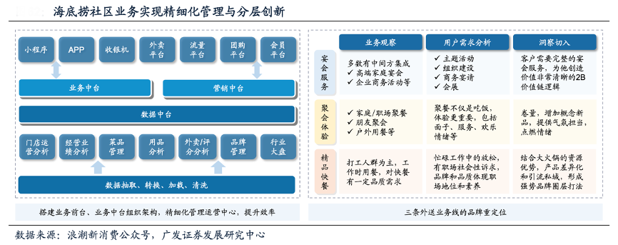 經(jīng)典案例:根據(jù)浪潮新消費公眾號、廣發(fā)證券發(fā)展研究中心等綜合資訊表明,海底撈目前已形成“外賣+社群+直播+線上商城”的社區(qū)營運模式,以海底撈 門店作為連接點,打通了多個消費場景。以外送業(yè)務(wù)為例,據(jù)海底撈社區(qū)營運總經(jīng)理張贏分享(援引自浪潮新消費公眾號),海底撈外送已形成宴會服務(wù)、聚餐體驗、精品快餐三條業(yè)務(wù)線。