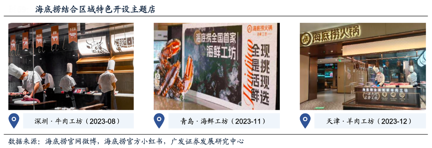 經(jīng)典案例:根據(jù)海底撈官方微博、海底撈官方小紅書、廣發(fā)證券發(fā)展研究中心等綜合資訊表明,海底撈于2023年下半年開設(shè)牛肉工坊(深圳卓越店)、海鮮工坊(青島李滄萬達店)、羊肉工坊(天津河?xùn)|萬達店)三家主題店,均為對原有門店進行部分區(qū)域增設(shè)和改造而成。三家主題店均結(jié)合區(qū)域特色,如牛肉工坊主打“鮮牛肉4小時配送到店”“1牛10吃”,特點接近潮汕火鍋。