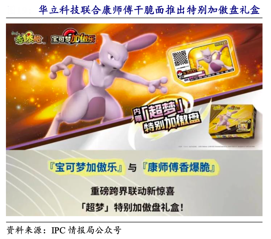 經(jīng)典案例:根據(jù)IPC情報局公眾號、開源證券研究所等綜合資訊表明,華立科技聯(lián)合康師傅干脆面推出特別加傲盤禮盒,包含香爆脆干脆面與一張?zhí)貏e加傲盤,加傲盤可用于在對應游藝機進行游玩或收藏。