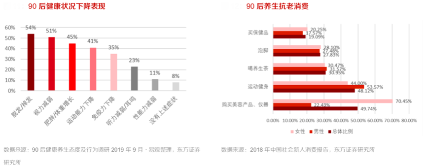 我們已經(jīng)進入了數(shù)字化技術驅動的“品質消費時代“,健康消費成為時代潮流。根據(jù)易觀、東方證券等綜合資訊表明,90后健康狀況下降明顯,脫發(fā)/掉發(fā)(54%)、視力減弱(51%)、肥胖//體重增長(45%)的90后占多數(shù),同時,2018年中國社會新人消費報告顯示,近五成的 90 后受訪者通過購買美容產(chǎn)品、運動健身等方式養(yǎng)生抗老,其中女性偏愛美容護膚,男性偏愛運動健身。