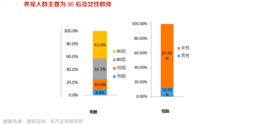 情感陪伴、治愈系情感等是90后消費的極大切入點。“懶系”養(yǎng)狗,精致養(yǎng)貓,重視醫(yī)療,為90后養(yǎng)寵帶來新商機。根據(jù)智研咨詢、東方證券研究所等綜合資訊表明,養(yǎng)寵人群主要為90后及女性群體,90后在養(yǎng)貓和養(yǎng)狗人群的占比分別為 47.5%和 43.0%,且單只寵物的消費金額呈逐年提升。根據(jù) 智研咨詢統(tǒng)計,養(yǎng)寵人群主要為 90 后及女性群體,女性比例高達 87.5%。