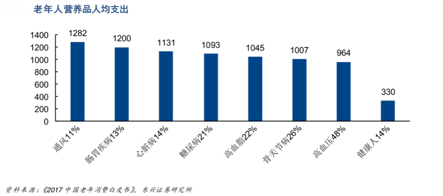 餐飲飯食一直是國內老年人消費的“熱點領域”,也是諸多企業品牌營銷策劃的“藍海地帶”,老年人的身體素質需要強化高營養、高質量的膳食營養,需要有基礎的健康用餐及營養配餐體系;根據東興證券等綜合資訊表明,老年人營養品人均支出多集中在高血壓、高血脂等健康領域,這些都營養配餐提出了更高要求,也提出了“品質化”特色。