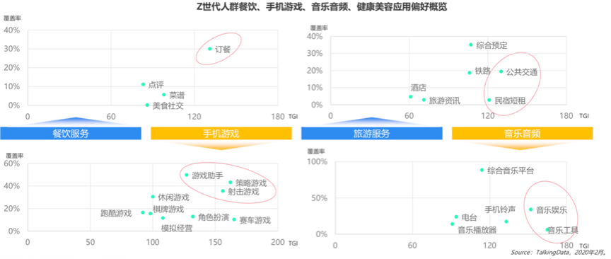 Z世代年輕化特征明顯,同時(shí)“興趣導(dǎo)向”更加顯著。根據(jù)TalkingData等綜合資訊表明,Z世代對(duì)訂餐服務(wù)類應(yīng)用的TGI顯著,外出更偏向使用省錢的公共交通,住宿則偏好文藝屬性較高的民宿短租,對(duì)游戲助手、策略游戲、射擊游戲等比較關(guān)注,同時(shí)對(duì)音樂娛樂、音樂工具等比較關(guān)注。