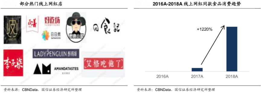 我們已經(jīng)身處數(shù)字化技術(shù)驅(qū)動(dòng)的時(shí)代,網(wǎng)絡(luò)社交正成為我們?nèi)粘J称废M(fèi)的一部分,有潮流感、有網(wǎng)絡(luò)感、有代入感的“網(wǎng)紅食品”日益成為一種“新食尚”。根據(jù)CBNData、國(guó)信證券經(jīng)濟(jì)研究所等綜合資訊表明,過(guò)去的線下?lián)屬?gòu)風(fēng)潮也傳播到線上,一些以網(wǎng)紅為首的店鋪受到了很大歡迎,如李子柒、野食小哥等食品網(wǎng)紅的店鋪,2018年網(wǎng)紅食品線上銷(xiāo)售增速達(dá)到 1220%。