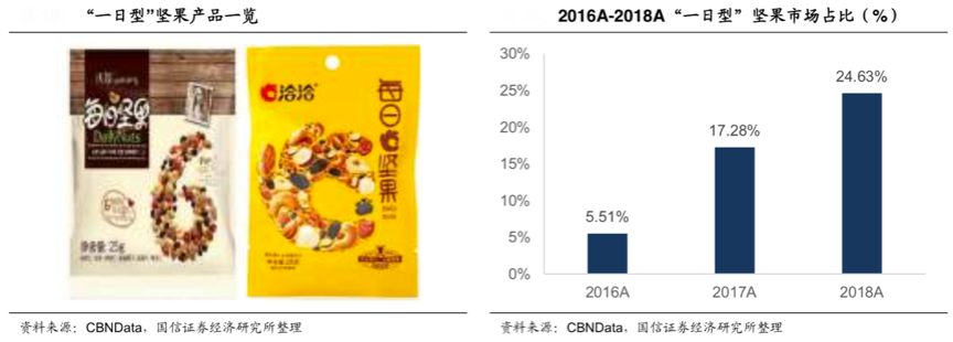 個(gè)性化、小包裝、多主題設(shè)計(jì)成為食品消費(fèi)的主流態(tài)勢(shì),目前小份裝零食成趨勢(shì),銷(xiāo)售量逐年上升,其中小袋裝的果干、堅(jiān)果等尤其受到歡迎。根據(jù)CBNData、國(guó)信證券經(jīng)濟(jì)研究所等綜合資訊表明,“一日型”等堅(jiān)果營(yíng)養(yǎng)搭配均衡,攜帶方便且隨時(shí)即食,深受消費(fèi)者喜愛(ài),近年來(lái)銷(xiāo)量逐年上升,2018 年“一日型”堅(jiān)果已經(jīng)占據(jù)了近四分之一的堅(jiān)果市場(chǎng)。