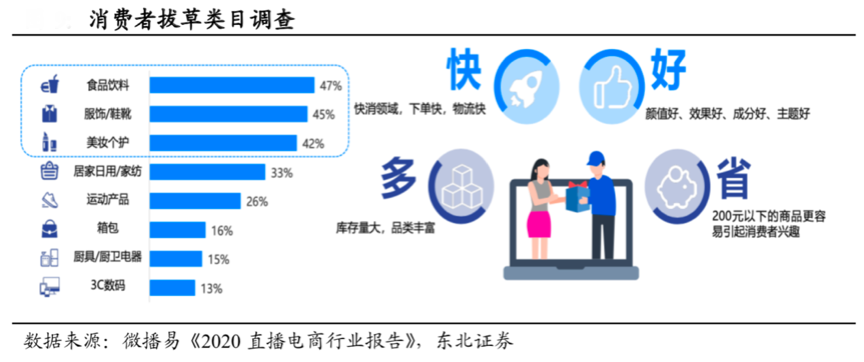 “直播電商”的品類消費傾向于低價、標準化的消費品,對價格的接受度有限,其消費場景相對固定。根據微播易《2020直播電商行業報告》等綜合資訊表明,直播電商的消費者的興趣主要集中在快消品上,對“性價比”要求較高,淘寶 2019 年人均支出在 9000 元+,快手用戶通常更青睞低價 好用的產品,快手 0-30 元和 30-50 元價格的產品較為火爆,產品和用戶更加下沉, 抖音用戶對價格的接受度更高,50-200 元產品整體均有爆款。