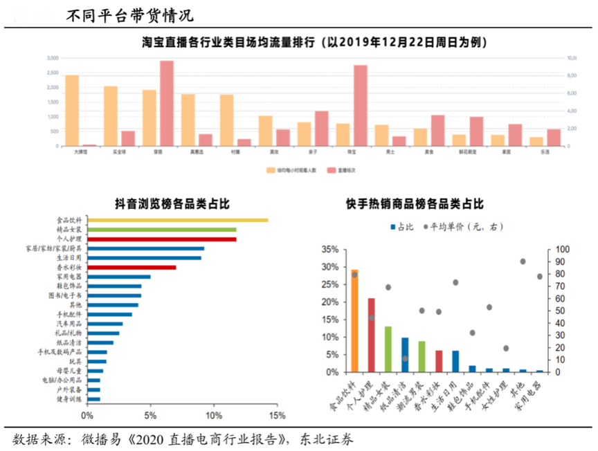 與此同時,優秀的直播電商品牌商需要根據各平臺不同的“品類帶貨”情況,不同直播電商平臺精準匹配不同品類,以提高品類轉化率。根據微播易《2020直播電商行業報告》、東北證券等綜合資訊表明,淘寶直播的品以珠寶、穿搭等高價格品類為主,彰顯高品質生活,有內容、有互動,而以抖音為代表的“中心化直播平臺”則以標準化產品如食品飲料、精品女裝、個人護理等為主,以快手為代表的“去中心化直播平臺”則以食品飲料、個人處理等100元以內的標準化消費品為主。