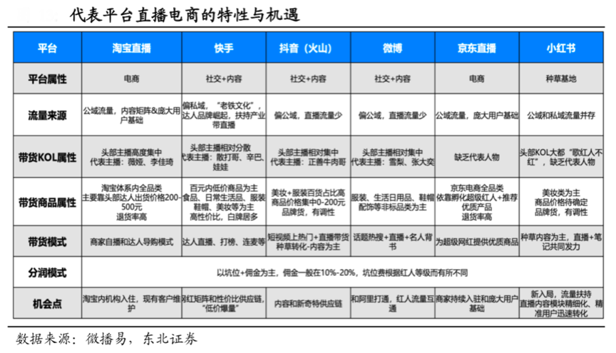 根據微播易、東北證券等綜合資訊表明,三大類直播電商平臺各有特色,電商平臺(淘寶、拼多多、京東等)、內容社交平臺(抖音、快手、微博等)、 種草類平臺(小紅書、B 站)。利益鏈切分較為共性:商家承擔 5%~10%的平臺抽傭,帶貨主播享有10%+的傭金分成,某些主播還會收取坑位費(即上鏈接的費用)。
