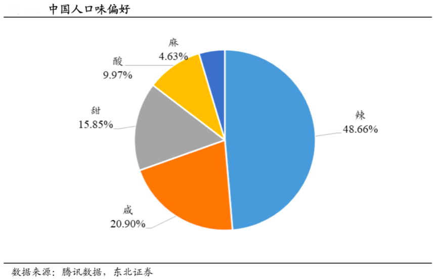 多數(shù)休閑食品產(chǎn)品擁有優(yōu)質(zhì)的食品消費(fèi)特性,“口味”、“特色”、“價(jià)格”等成為消費(fèi)者對(duì)休閑食品品牌的強(qiáng)烈感知因素,更容易成為休閑食品企業(yè)品牌營銷策劃創(chuàng)新的“優(yōu)質(zhì)路徑”。根據(jù)騰訊數(shù)據(jù)、東北證券等綜合資訊表明,48.66%的中國人最喜愛的口味是“辣”,泡鹵制食品多具有香、酸、辣和爽口的特點(diǎn),其風(fēng)味符合消費(fèi)者對(duì)辣味的偏好。