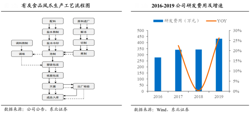 經(jīng)典案例:根據(jù)公司公告、東北證券等綜合資訊表明,有友設(shè)立了獨(dú)立的研發(fā)中心,將“肉食品發(fā)酵、保鮮”等現(xiàn)代生物技術(shù)與傳統(tǒng)的四川泡菜工藝相結(jié)合,優(yōu)選復(fù)合乳酸菌種,并配以公司秘方使產(chǎn)品口味獨(dú)特。同時(shí),為解決雞爪人工切制效率低的問題,公司歷時(shí)8年研制出“全自動(dòng)雞爪切割機(jī)”,并攻克了泡椒鳳爪保質(zhì)期較短的難題。