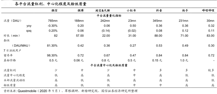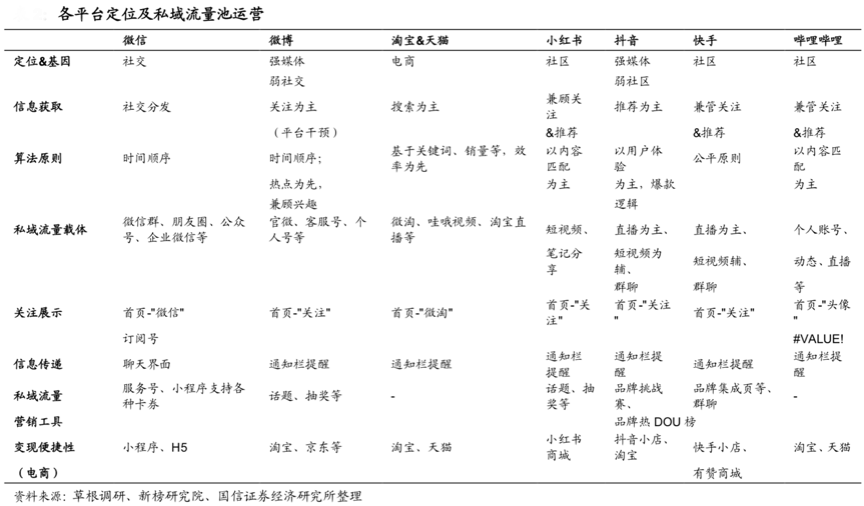 建立健全“品牌私域流量體系”需要企業(yè)深度洞察互聯(lián)網(wǎng)平臺競爭動態(tài),放大各平臺流量紅利,視其流量紅利、中心化程度及粉絲質(zhì)量重構“品牌經(jīng)營邏輯”,需要更加重視抖音、快手等崛起新力量,同時強化淘寶天貓等基礎商業(yè)交易陣地,持續(xù)放大“微信主陣地”價值。根據(jù)Questmobile、草根調(diào)研、新榜研究院和國信證券研究所等綜合資訊表明,從日活用戶數(shù)角度看,微信一家獨大,其次是抖音,在之后淘寶 &天貓、快手、微博相差不多,嗶哩嗶哩與小紅書則更加垂直。