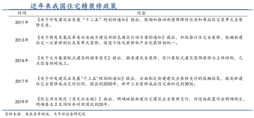 “精裝修”和“預(yù)裝式建筑”是近年內(nèi)房地產(chǎn)建材家居行業(yè)成長主線。隨著國家房地產(chǎn)政策的更新,近年來地產(chǎn)精裝修政策支持力度大力強化,2017年住建部印發(fā)的《建筑業(yè)發(fā)展“十三五”規(guī)劃》中提到,到2020年新開工全裝成品住宅面積占比達到30%,加速了國內(nèi)精裝修市場的發(fā)展。截止到2019年11月份,全國涉及全裝修/精裝修的各類政策累計頒布90次,覆蓋27個省市,其中近兩年呈加速態(tài)勢,越來越多省市支持精裝修房的發(fā)展。