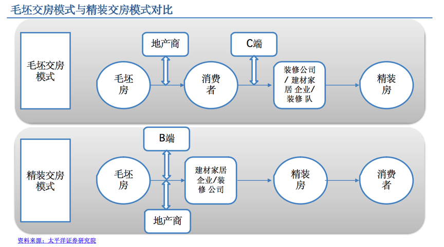 “精裝修”開啟了家居企業(yè)B端業(yè)務(wù)拓展及大宗交易的“寬通道”,細(xì)分精裝房市場期盼“行業(yè)王者”的誕生。新的家居精裝修行業(yè),創(chuàng)新新的數(shù)字化家居消費需求,締造精裝房“產(chǎn)業(yè)級領(lǐng)袖品牌”。根據(jù)太平洋證券研究院等綜合資訊表明,相比毛坯交房模式,精裝交房模式下地產(chǎn)商可以依托自身平臺集采能力,將上游原材料供應(yīng)商進行整合,家居建材企業(yè)的客戶不再是零售市場分散的消費者,而是擁有較強資源整合力的房地產(chǎn)企業(yè),集中度更高。搶占精裝房產(chǎn)業(yè)級地位,締造“精裝消費”大品牌。