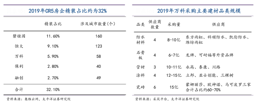 縱觀國內(nèi)精裝房市場,地產(chǎn)商占據(jù)業(yè)務(wù)主導(dǎo)權(quán),壟斷型市場競爭的態(tài)勢日益明顯。根據(jù)奧維云網(wǎng)、太平洋證券研究院等綜合資訊表明,2019年TOP5房企精裝修市場份額為32%,同比去年下滑約7個pct,從2019年萬科針對主要建材品類采購情況來看,供應(yīng)商主要集中于行業(yè)頭部幾家企業(yè),涂料、瓷磚的采購規(guī)模相對較大,其次為管材和防水,而石膏板在住宅領(lǐng)域占比相對用量較小。
