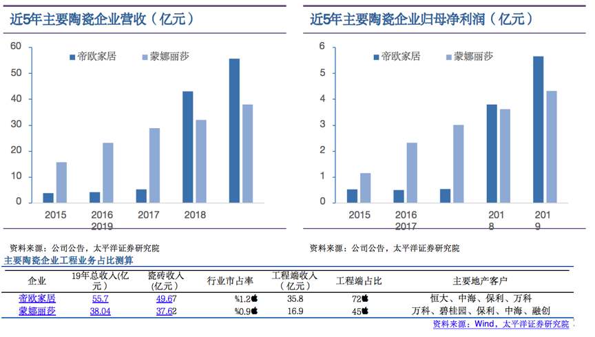 國內(nèi)精裝修業(yè)務(wù)經(jīng)營策劃中,建材家居企業(yè)多數(shù)愿意和國內(nèi)知名地產(chǎn)商合作,通過知名地產(chǎn)商、知名地產(chǎn)項目等揚名“精裝修業(yè)務(wù)領(lǐng)域”,建立精裝修業(yè)務(wù)領(lǐng)域的“品牌競爭優(yōu)勢”。根據(jù)公司公告、太平洋證券研究院等綜合資訊表明,從2019年營收規(guī)模來看,三棵樹營收接近60億(+66.6%),其中工程涂料占比約46.3%(+57.2%),公司連續(xù)十年獲得恒大優(yōu)秀材料設(shè)備供應(yīng)商,工程端業(yè)務(wù)快速發(fā)展;亞士創(chuàng)能19年涂料收入約17.9億元(+55.63%),公司涂料業(yè)務(wù)主要聚焦在B端,同樣保持較快增速。