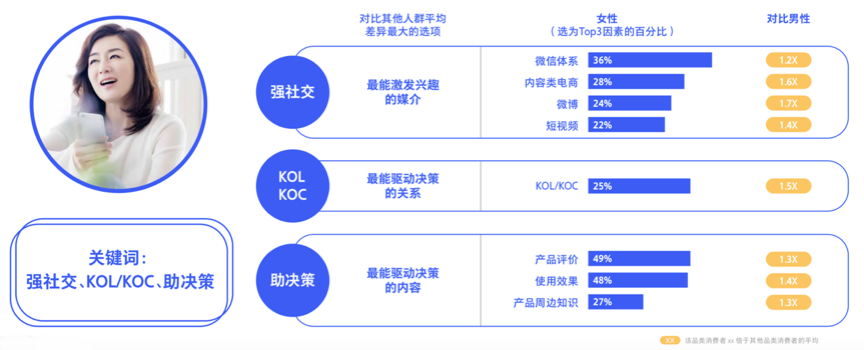 據騰訊、BCG《2020中國社交零售白皮書》調查數據表明,56%女性易被社交媒介激發興趣,高于男性的45%,尤其是微信體系、內容類電商、微博和短視頻;同時,她們喜愛閱讀他人評價,利用他人判斷幫助自己決策,更容易被他人影響、被KOL/KOC種草。
