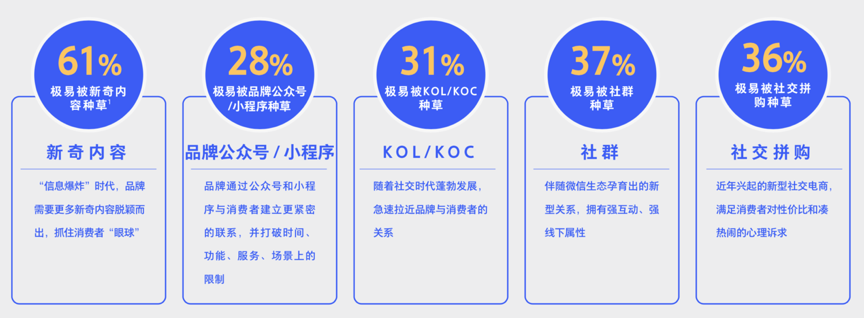 據騰訊、BCG《2020中國社交零售白皮書》調查數據表明,高達61%的用戶極易被新奇內容種草,“品牌公眾號/小程序”基本上成為各類消費人群社交新零售的重要承載,也成為各大品牌商的重要“角逐地”,31%的用戶更容易受到KOL/KOC人群的種草,37%的人在社群中更加活躍,社交拼購成為各類消費人群倍受歡迎的“活動方式”。