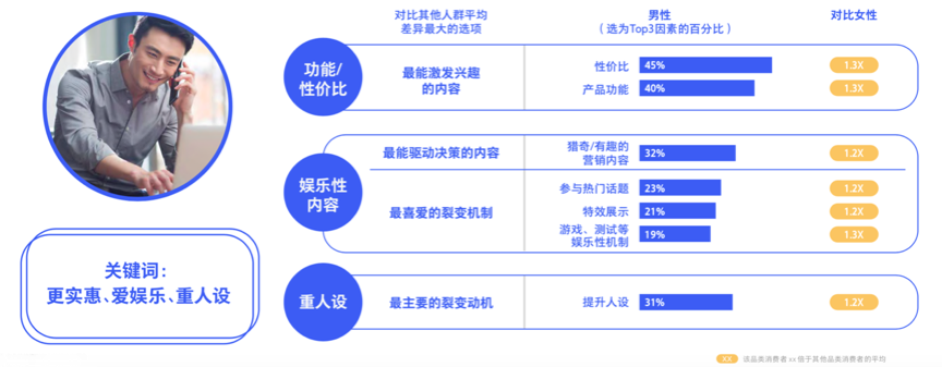 據騰訊、BCG《2020中國社交零售白皮書》調查數據表明,男性對性價比和產品功能更感興趣,其決策與裂變時對娛樂性內容的偏好更強,同時比較注重人設,會更謹慎產品文章內容是否真實而決定是否裂變。