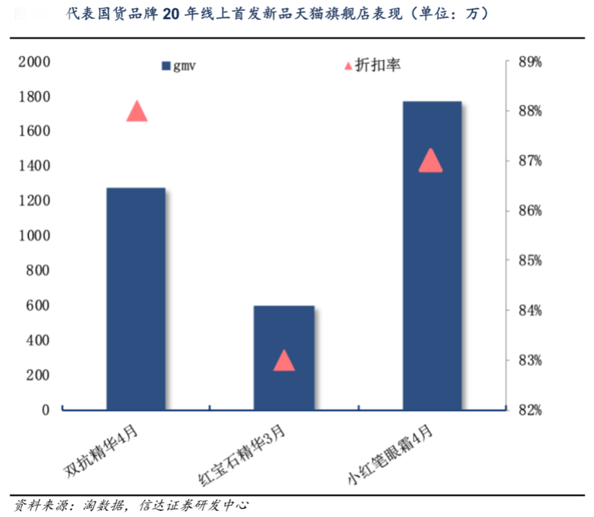 化妝品的內(nèi)容種草及活動拔草等已經(jīng)成為行業(yè)主流,各品牌紛紛強化“品牌化賦能”,彰顯優(yōu)質(zhì)美妝品牌影響力的同時,放大新品上市的價值,積極收集沉淀各類美妝消費數(shù)據(jù)。根據(jù)阿里媽媽、信達證券研發(fā)中心等綜合資訊表明,2019年以來,各大品牌嘗試將天貓官方旗艦店當作新品首發(fā)陣地,通過“流量明星代言+站外推廣(種草)+直播(拔草)”等鏈條集中資源投放,以沉淀消費者資產(chǎn)的數(shù)據(jù)銀行為基礎,新品設計到推廣體現(xiàn)出良好效果。以國貨品牌為例,3-4月珀萊雅的 兩款精華新產(chǎn)品GMV近2000萬,折扣率保持在80%以上,丸美小紅筆眼霜在推出當月獲得近1800萬GMV,折扣率超過85%。