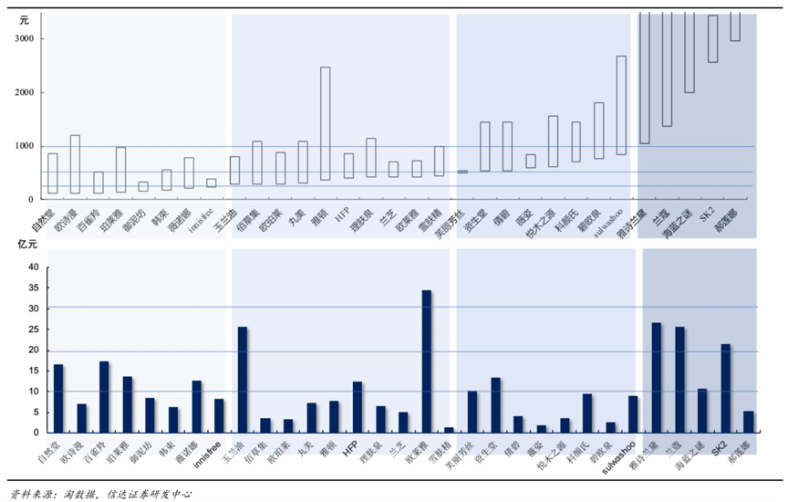 優(yōu)秀的美容化妝品品牌已經(jīng)在做“分品牌經(jīng)營”,品牌細分化、分層化經(jīng)營已經(jīng)成為國內(nèi)品牌營銷策劃的“主流做法”。根據(jù)淘數(shù)據(jù)、信達證券研發(fā)中心等綜合資訊表明,以淘系GMV體量超過1.4億的31個護膚品牌為例,以其天貓旗艦店主推產(chǎn)品系列價格為參考,勾畫護膚品行業(yè)競爭圖譜,數(shù)據(jù)顯示如下:1)基礎護理套裝最低產(chǎn)品價格 300 元以下的品牌有 9 個,其中 5 個GMV超過 10 億;2)基礎護理套裝最低價格超過1000元的品牌有 5 個,其中 4 個GMV超過 10 億,3個GMV超過20億。同時,規(guī)模以上品牌商價格帶分層明顯,高端線競爭格局較好,大眾線同質(zhì)化護膚訴求亦可滋養(yǎng)出體量較大多個品牌。