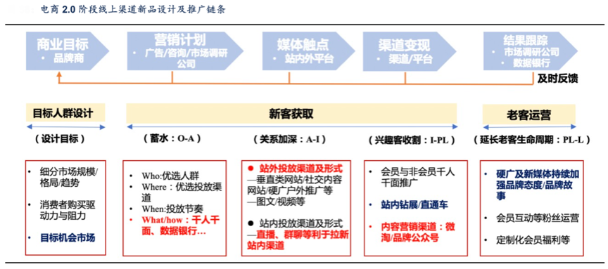 同時,以網(wǎng)絡營銷策劃為特征的“網(wǎng)絡銷售”風生水起,其承擔著樹立品牌形象、提升銷售業(yè)績、打通消費者運營鏈路等多重市場營銷職能,強調(diào)線上運營的數(shù)字化、全鏈路及數(shù)據(jù)化,既可以快速提升用戶對品牌的認同感,又可以全面賦能企業(yè)數(shù)字營銷策劃。根據(jù)市場公開數(shù)據(jù)表明,以百雀羚官方旗艦店 2018 年流量推廣費用投放看,鉆展/直通車/品銷寶/淘客/聚劃算推廣費用占比綜合推廣費用比重分別為 25%/23%/22%/14%/5%。2017年,平臺提出“全域營銷”等概念,數(shù)據(jù)銀行是基礎,可回流與沉淀品牌與消費著的互動,追蹤消費者全鏈路狀態(tài),真正讓美妝品牌營銷策劃的“數(shù)據(jù)賦能”發(fā)揮了價值。