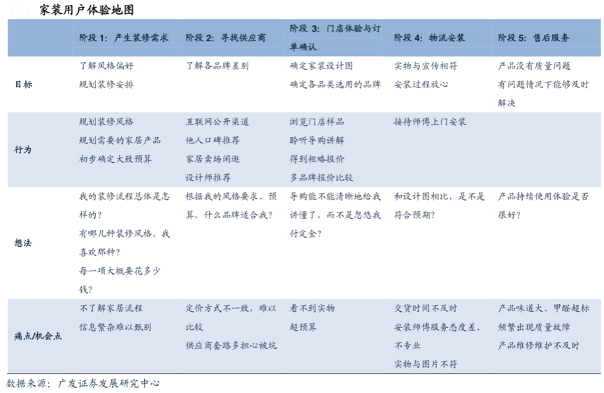 以家裝行業品牌策劃為例,根據廣發證券發展研究中心等綜合資訊顯示,“家裝用戶體驗地圖”涉及到需求產生、供應商尋找、門店體驗與訂單確認等多個環節;前瞻家裝家居行業發展,消費者的家裝消費痛點集中在三個方面:1)不清楚裝修的核心需求及實現方式,單純靠用戶只能表達裝修的結果及想展現的家居生活,具體怎樣選擇風格、規劃裝修及配備怎樣的建材產品、家具等家居消費者并不很清楚;2)對終端門店體驗一般,需要走多家門店、權衡多家品牌才能真正實現自己的裝修方案;3)希望服務商、品牌商對家裝過程進行適度跟進及有效反饋,不是一賣了之。