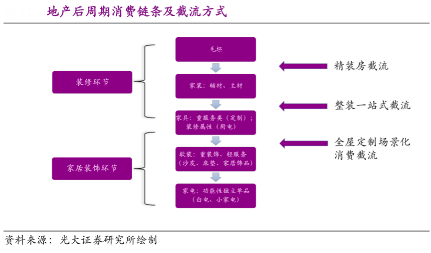 與其它消費品行業相比,家居消費深受地產行業影響,根據光大證券研究所繪制的相關資料顯示,在地產后周期時代,家居消費被精裝房半個、整裝一站式、全屋定制場景化消費等多次消費截流,消費者被大量的細分截流,此種“多重消費截流”的情形下,家居新零售品牌營銷策劃需要更加關注終端的消費體驗,放大品牌背書,亮化品牌的品質化表達。