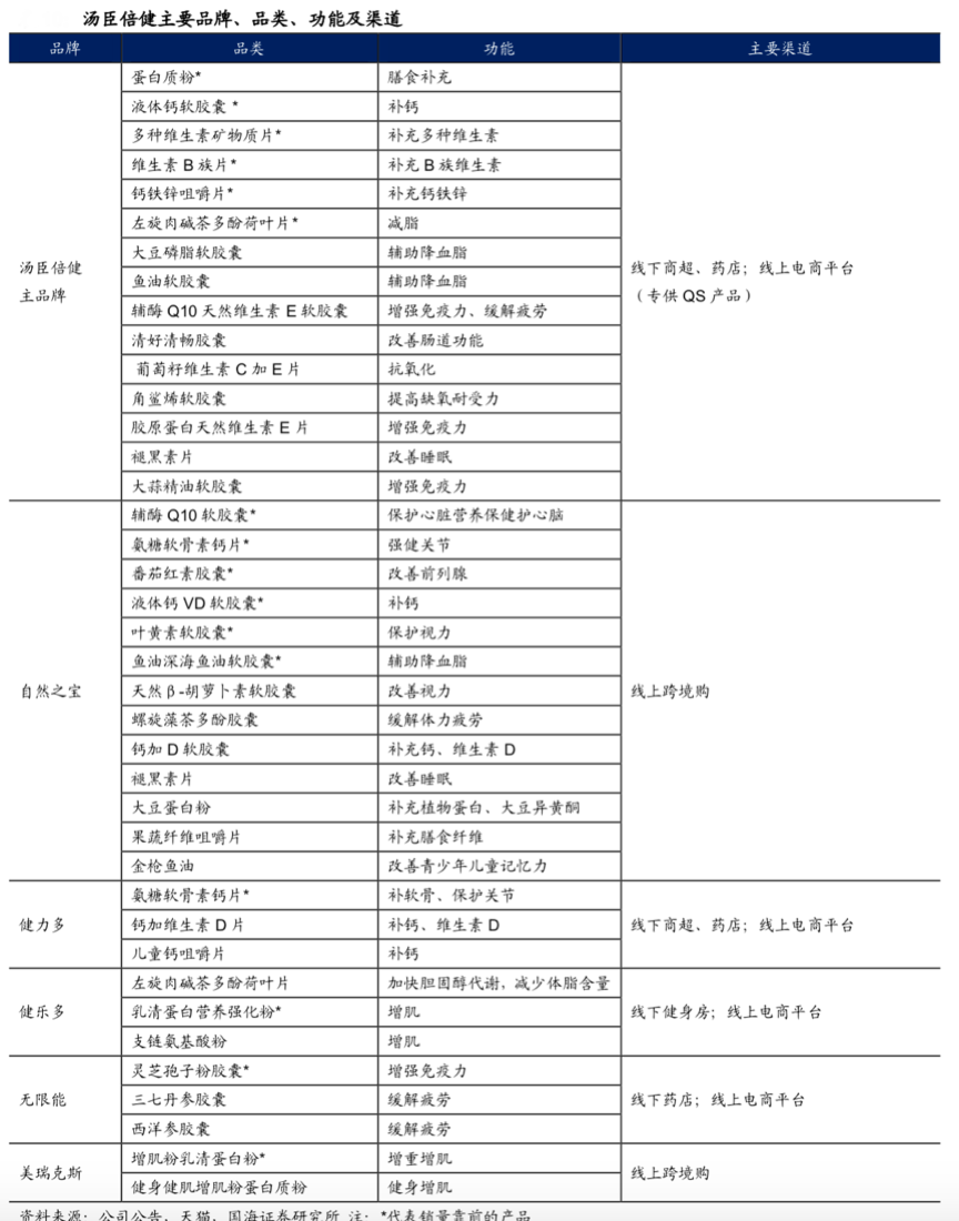 經(jīng)典案例:根據(jù)公司公告、天貓、國海證券研究所等綜合資訊表明,湯臣倍健以健力多、健樂多、無限能等多個品牌覆蓋線上電商、線下商超健身房間等多類終端,湯臣倍健主品牌銷售額占比90%以上,產(chǎn)品包含蛋白質(zhì)、維生素、心腦血管等16個分類,涵蓋了幾乎維生素/膳食補(bǔ)充劑市場的所有產(chǎn)品。
