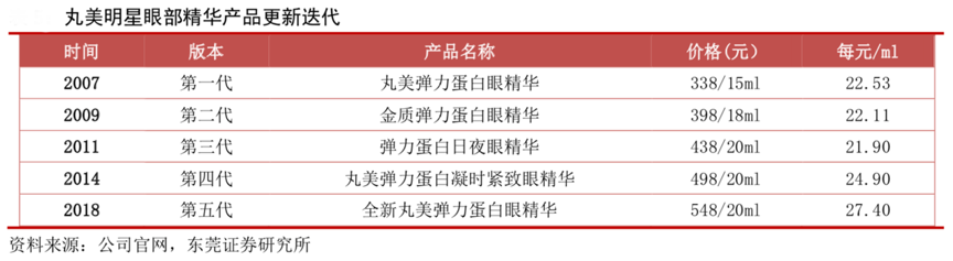 經(jīng)典案例:根據(jù)公司官網(wǎng)、東莞證券研究所等綜合資訊表明,其產(chǎn)品策略主要是針對(duì)核心產(chǎn)品進(jìn)行更新迭代,目前已升級(jí)至第五代,第五代彈力蛋白精華素實(shí)現(xiàn)收 入 7,278.80 萬(wàn)元,占丸美品牌眼部護(hù)膚類(lèi)產(chǎn)品收入的13.88%,優(yōu)秀的產(chǎn)品力創(chuàng)造了獨(dú)特的“產(chǎn)品品牌價(jià)值”,點(diǎn)燃了產(chǎn)品“高品質(zhì)護(hù)理”的消費(fèi)價(jià)值。