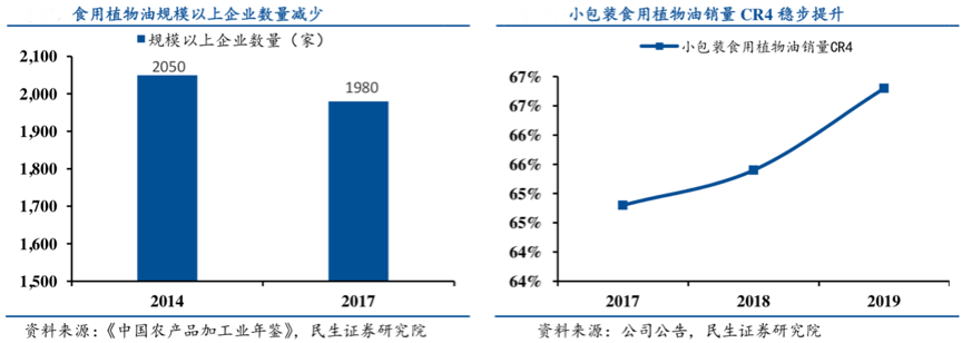 經典表現:根據《中國農產品加工業年鑒》、公司公告、民生證券研究院等綜合資訊表明,食用植物油規模以上企業由 2014 年的 2050 家減少至 1980 家,減少 3.5%。與此同時小包裝食用植物油 CR4 由 2017 年的 64.8%穩步提升至 68.8%,集中度不斷提高。食用植物油企業要想快速發展,就需要建立自己的產業品牌意識,刷新自己的產業思維,由此打造產業型品牌。
