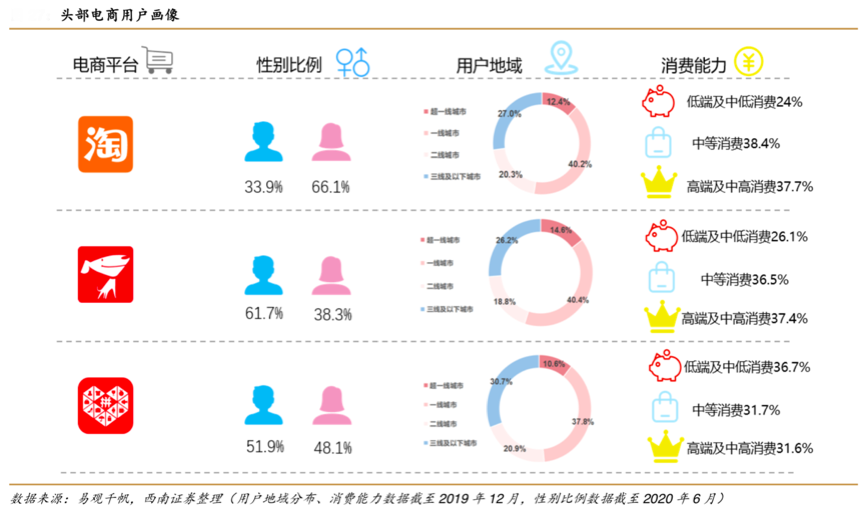 經(jīng)典案例:根據(jù)易觀千帆、西南證券等綜合資訊表明,各頭部電商用戶畫(huà)像不同,京東用戶以中高等消費(fèi)男性為主,淘寶用戶以中高端消費(fèi)女性為主,而拼多多偏向于中低端下沉市場(chǎng)。對(duì)比手機(jī)淘寶和拼多多,京東的男性用戶比例高達(dá) 61.7%,而手機(jī)淘寶、拼多多分別為 33.9%、51.9%。這些正是各科技型互聯(lián)網(wǎng)平臺(tái)企業(yè)推進(jìn)用戶經(jīng)營(yíng)、推動(dòng)用戶品牌創(chuàng)新的“堅(jiān)實(shí)人群消費(fèi)基礎(chǔ)”。